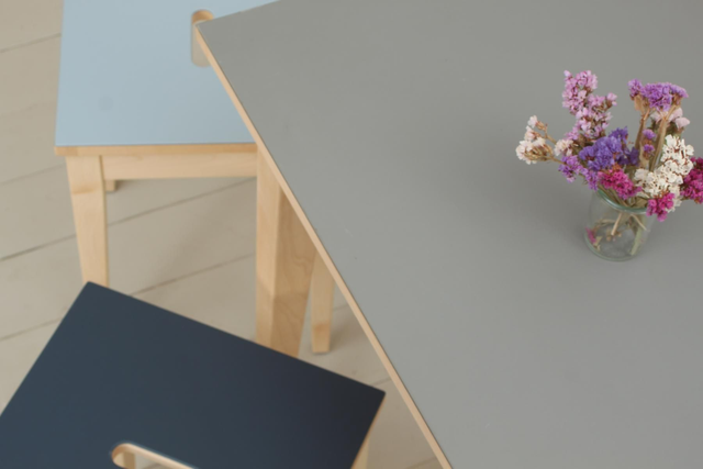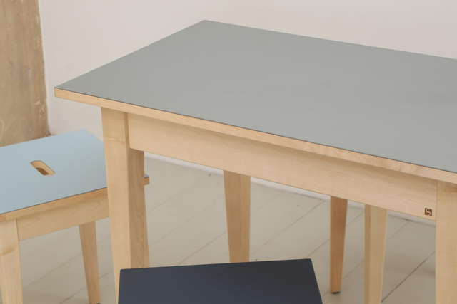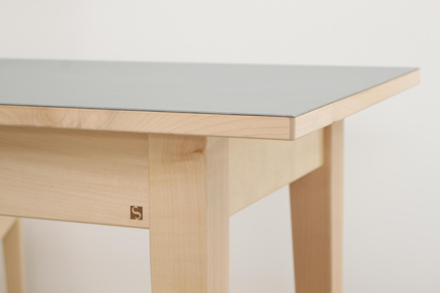 Platte und Ansteckplatte: Tischlerplatte mit Anleimer Ahorn massiv, belegt mit Linoleum, Gegenzug aus Tannefurnier