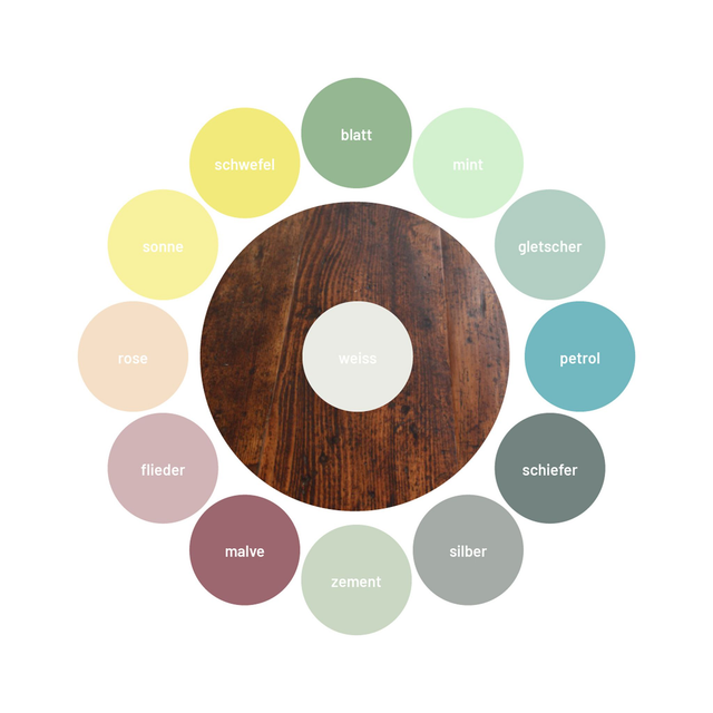 Gestell: regionales Ahornholz, handgestrichen mit reiner lösemittelfreier Leinölfarbe. Platte: Tannen/Fichtenholz aus 100-300 Jahre alten Holzfußböden, Oberfläche Hartwachsöl. Farben: weiß, schiefer, silber, zement, mint, gletscher, petrol, blatt, schwefel, sonne, rose, flieder, malve