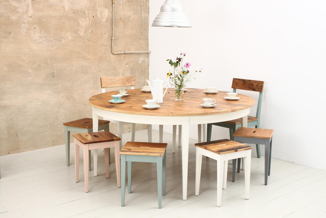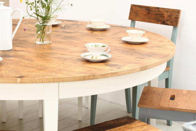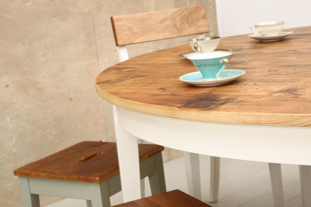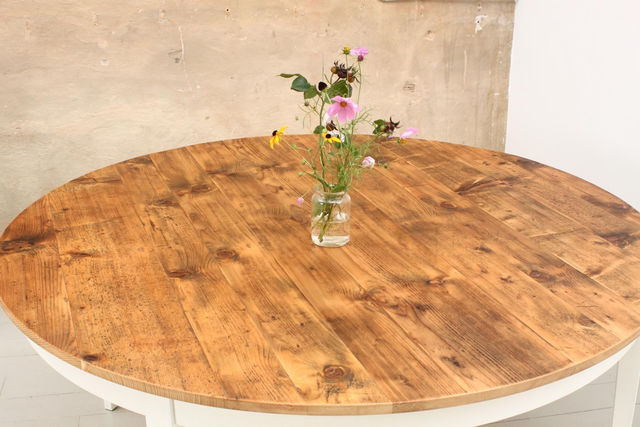 Klassischer Rundzargentisch mit Platte aus historischen Bodendielen